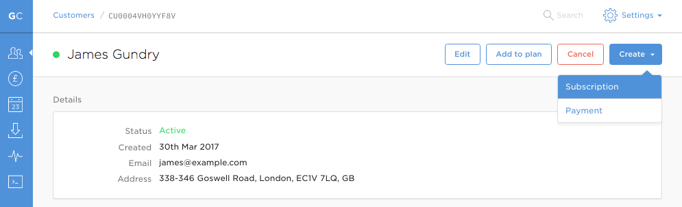 Der Dauerauftrag wird jetzt im entsprechenden Abschnitt des Kundendatensatzes angezeigt. Wenn ab jetzt eine Zahlung fällig wird, wird sie erstellt und im Abschnitt „Zahlungen“ des Kundendatensatzes sowie auf der Seite „Zahlungen“ Ihres Dashboards angezeigt.