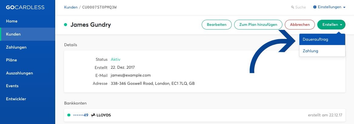 Es gibt zwei Möglichkeiten, einen Dauerauftrag mit wiederkehrenden Zahlungen für einen bestehenden Kunden einzurichten: