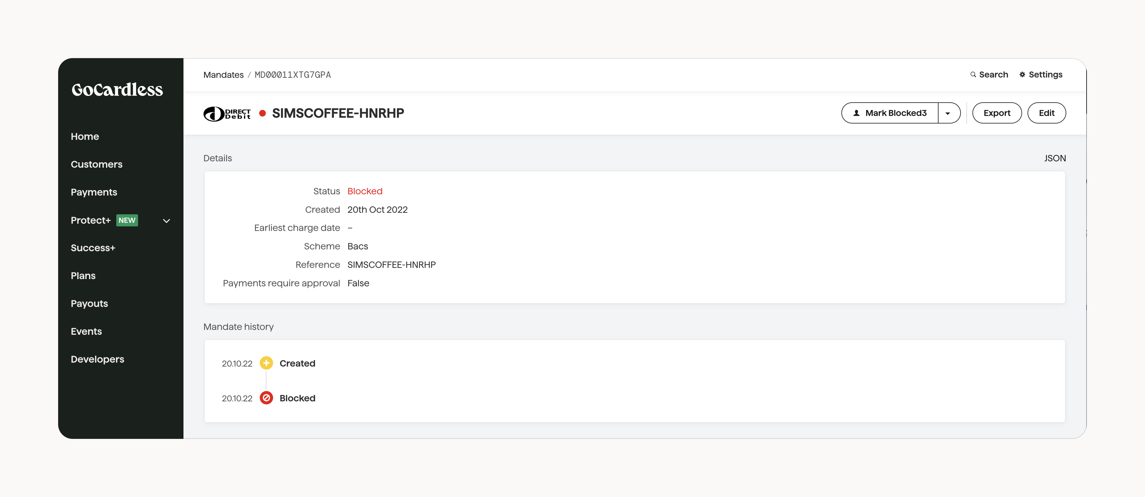 Im Dashboard können Sie nach der mandate_id suchen. Sie gelangen so zum Verlauf des entsprechenden Lastschriftmandats und können überprüfen, ob es blockiert ist: