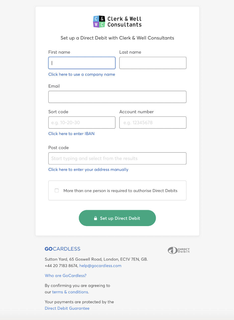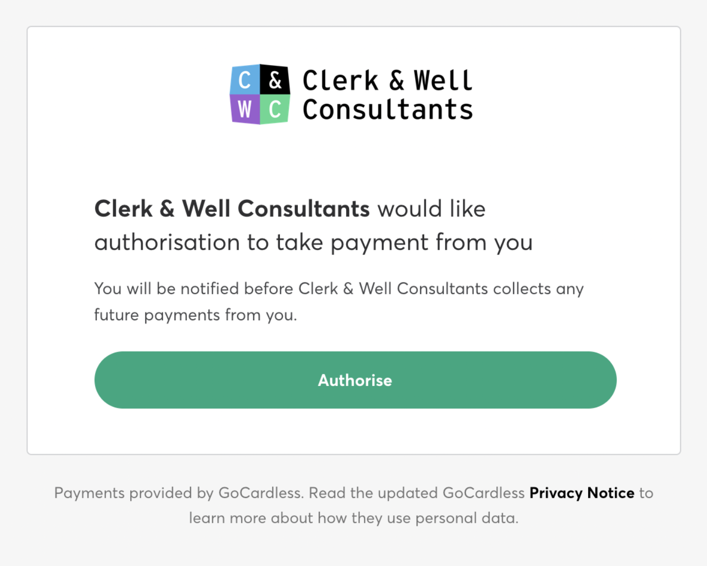 1. Ihre Kunden erhalten eine Begrüßungs-E-Mail, in der sie darum gebeten werden, Ihnen eine Einzugsermächtigung zu erteilen. Die E-Mail enthält einen Link zu der von GoCardless gehosteten Zahlungsseite.