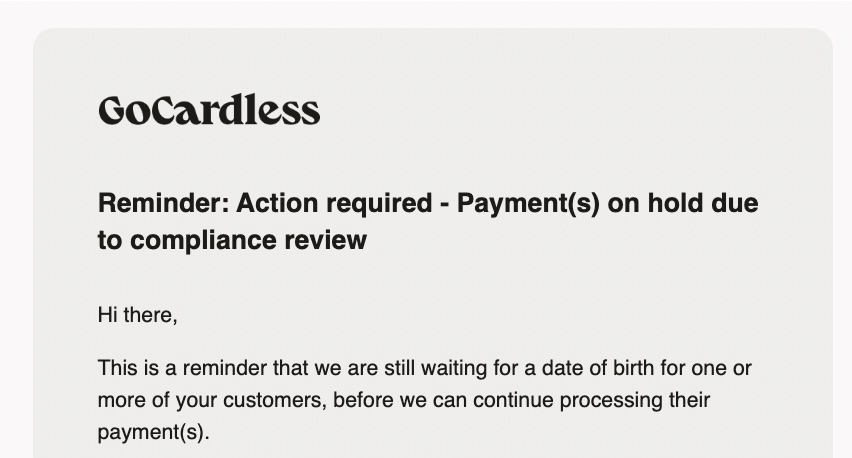 As part of our ongoing commitment to regulatory compliance, GoCardless automatically monitors all payments.
