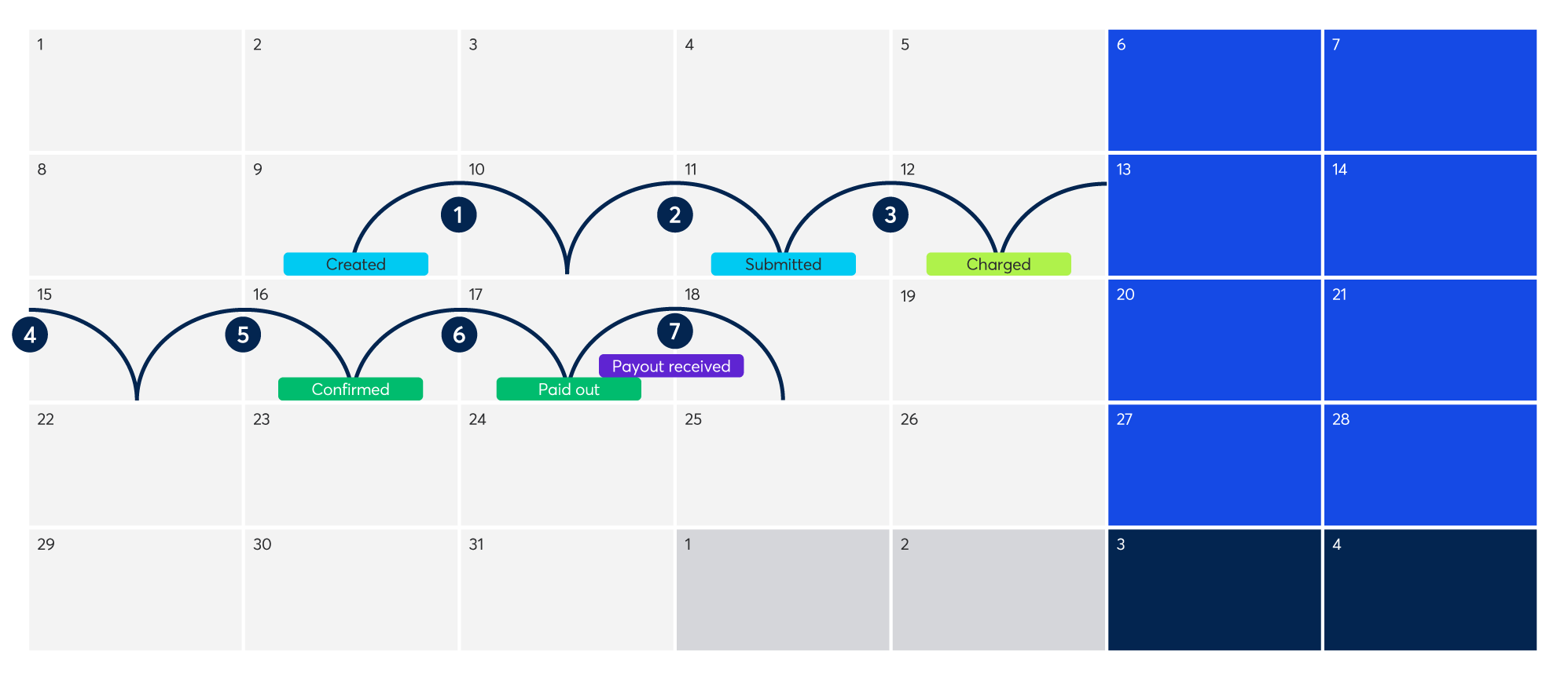 Please note: 'Created' refers to the creation deadline - the latest day a payment can be created (at 4 pm UK time) to be collected from the customer on the charge date shown in the calendar example above.
