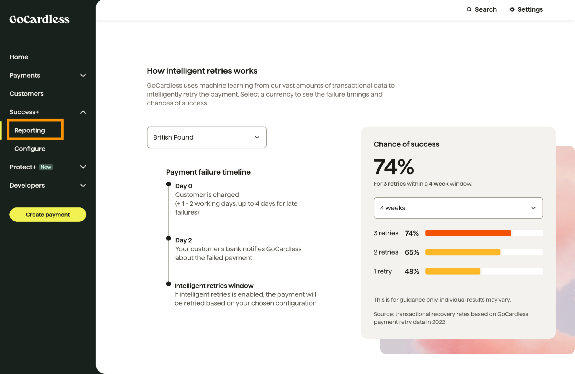 When using Success+, our intelligent solution for managing & retrying failed payments, you can view the related reports on the Success+ Reporting page. This page provides insights to help you understand the probability of recouping failed payments per each currency when Success+ is utilised for intelligent retries.