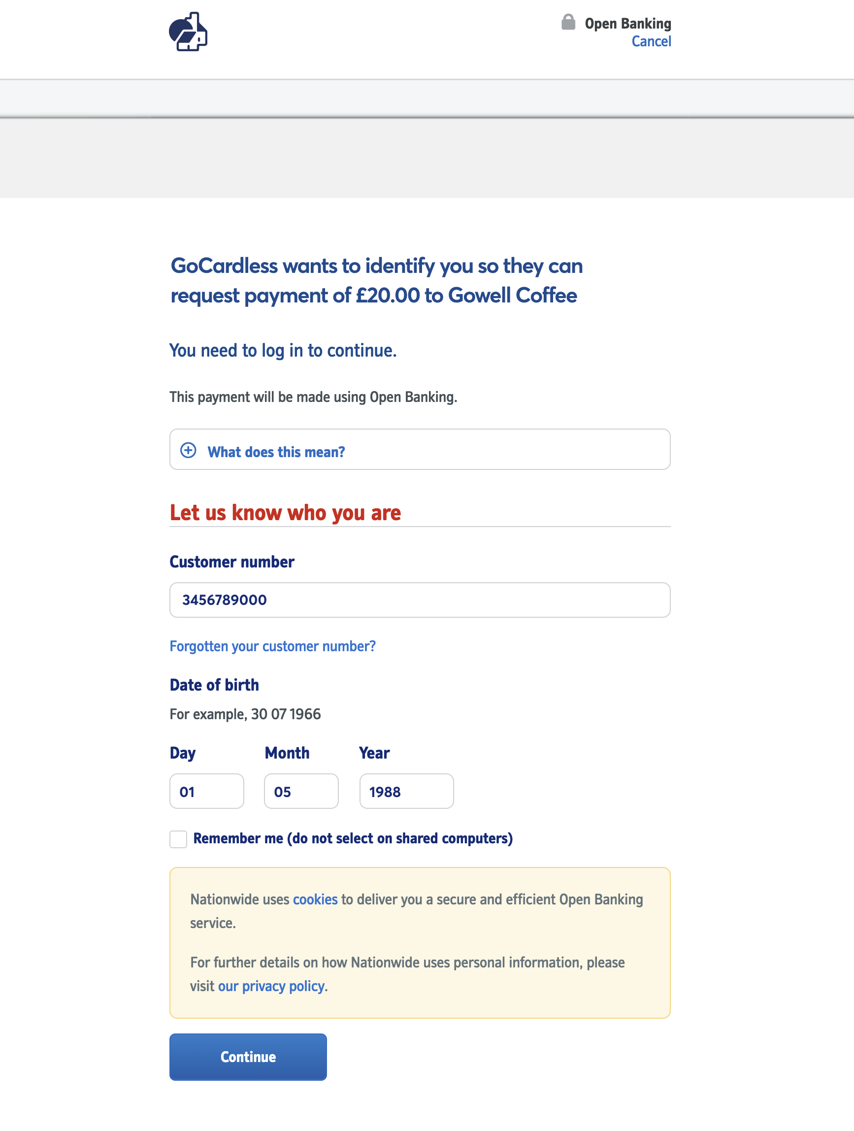 2. Your customer will be taken to a confirmation page where they can check the details and when they're ready, click Continue to proceed.