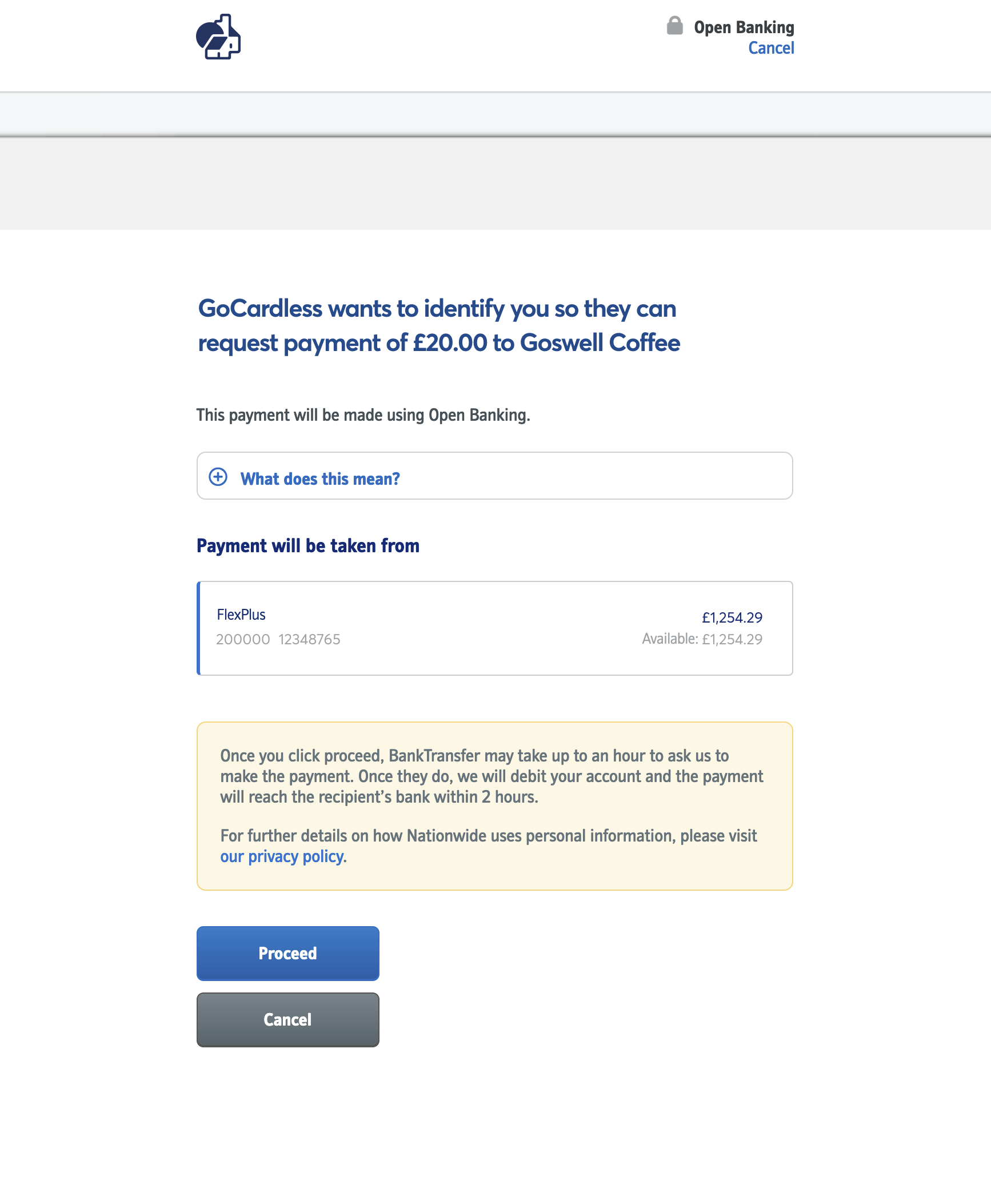 4. Once your customer has successfully completed the verification step with their bank, they will be directed to a screen asking them to proceed with the payment.