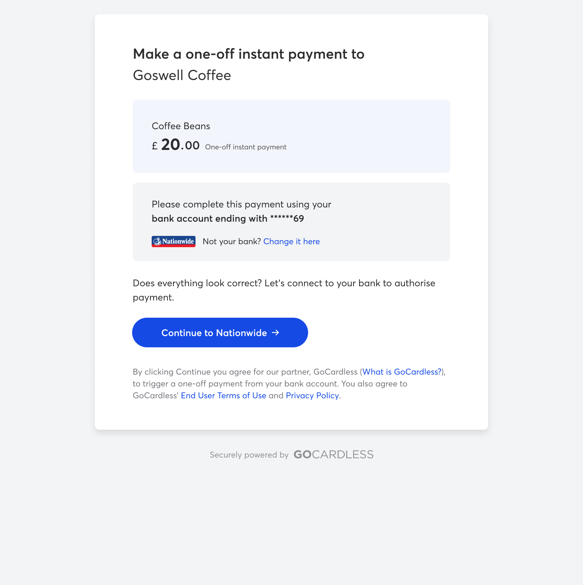 Here is what your customer will see if you request a one-off payment. You can test the Instant Bank Pay flow yourself and make a charitable donation in the process, or watch the demo video here.