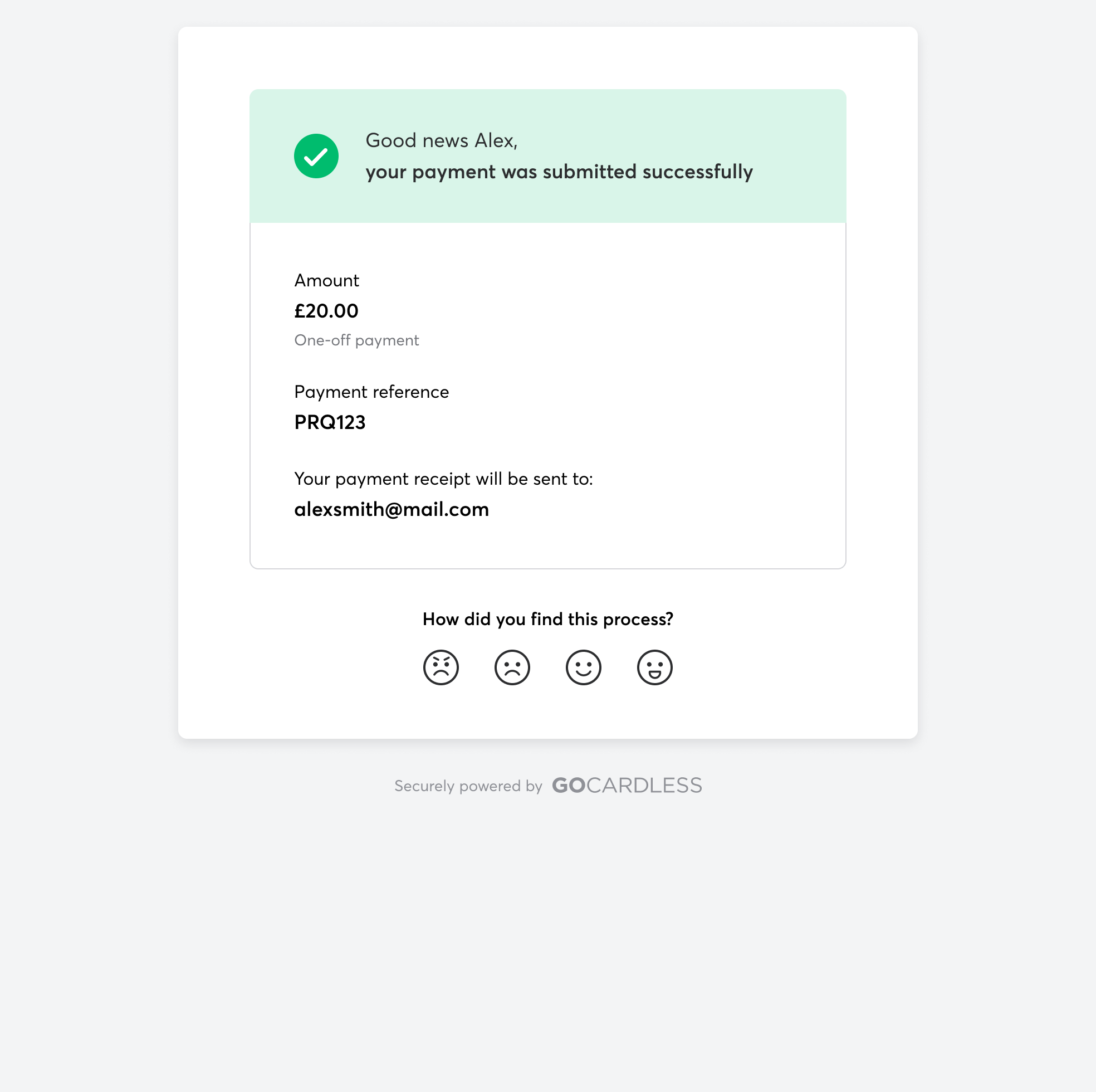GoCardless Ltd (company registration number 07495895) is authorised by the Financial Conduct Authority under the Payment Services Regulations 2017, registration number 597190, for the provision of payment services.