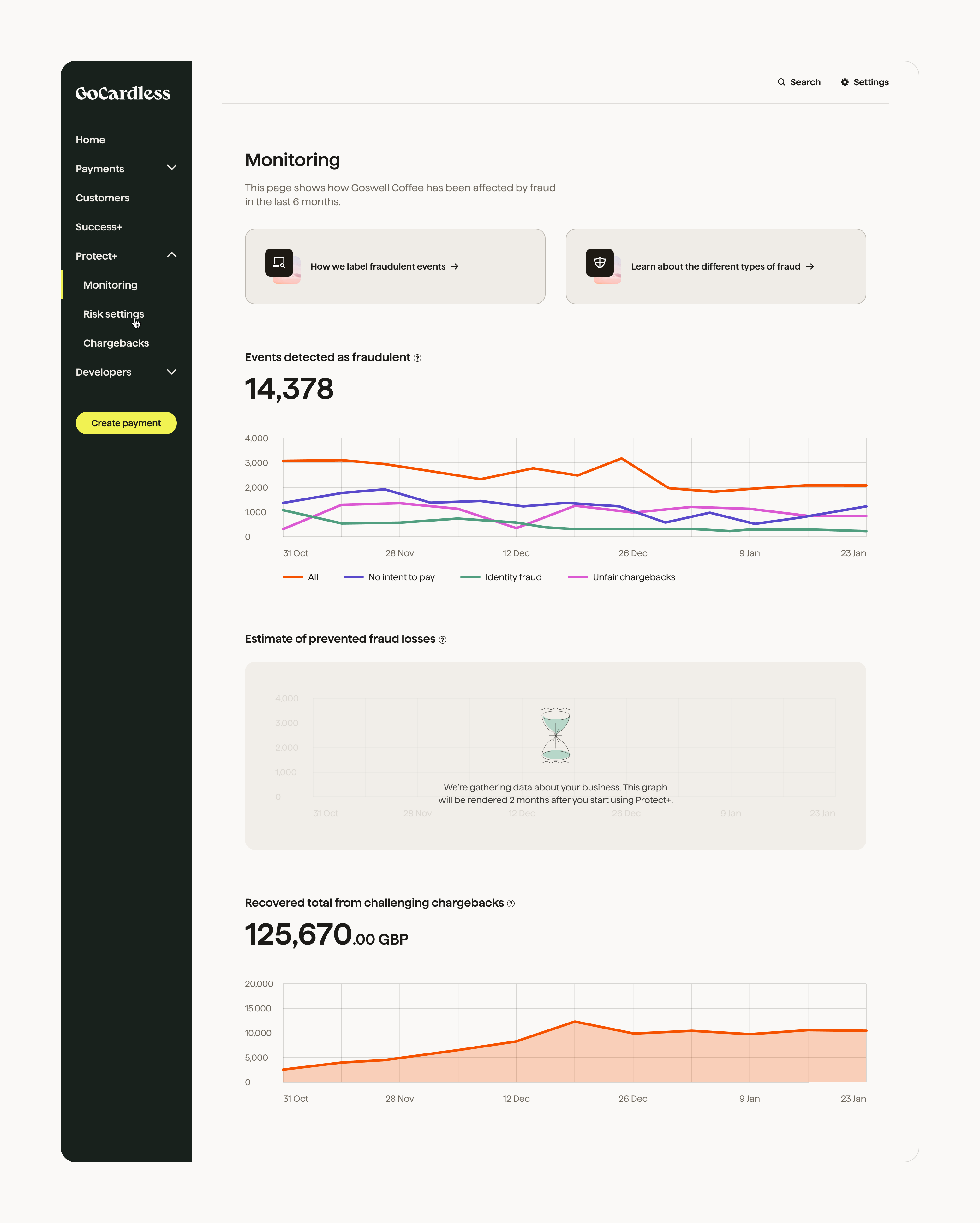 • Access data on the performance of GoCardless Protect+ features: