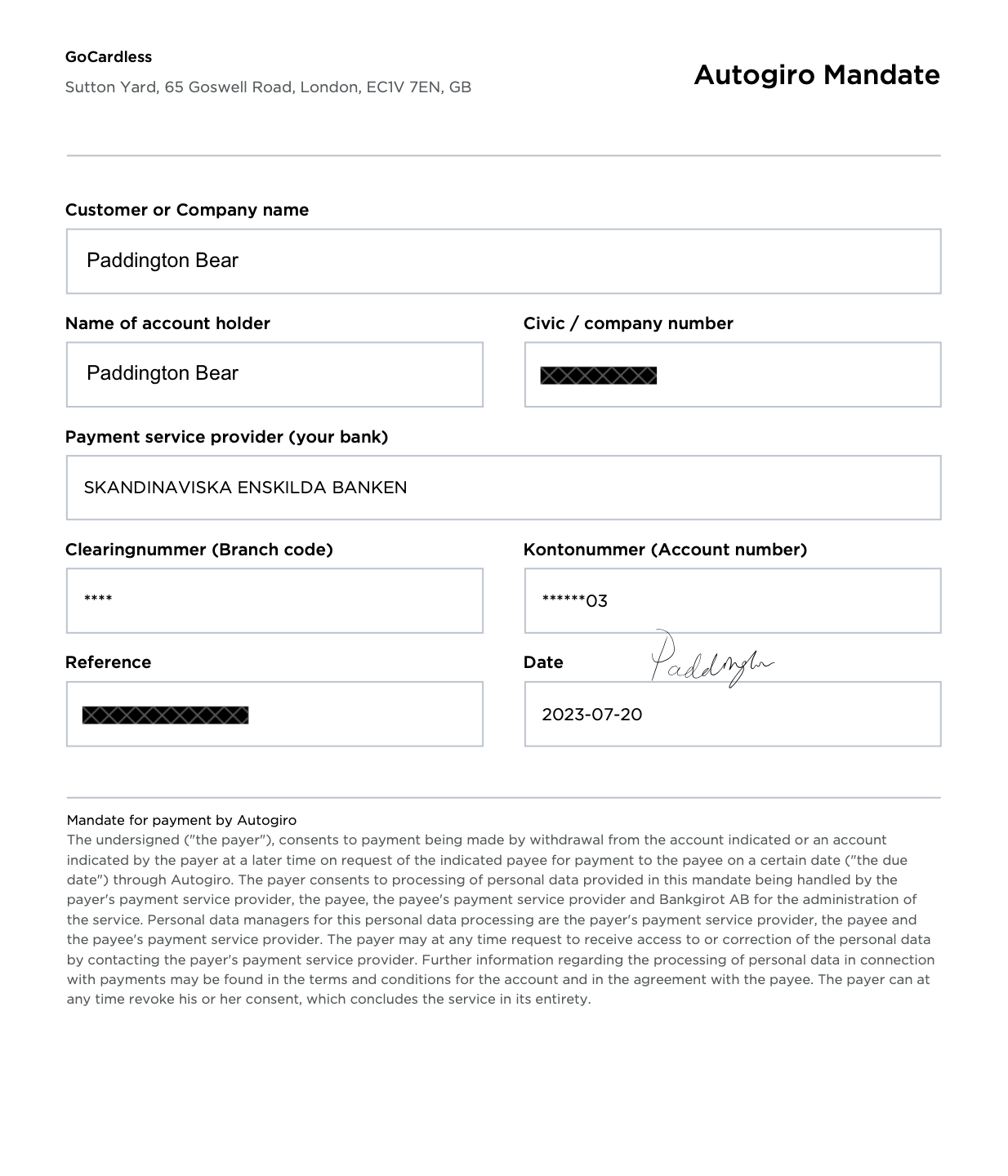 Print the mandate and ask your customer to sign it - for the Autogiro paper form, there is not a specific signature box, but we recommend that you ask your customer to sign above the date box, like this: