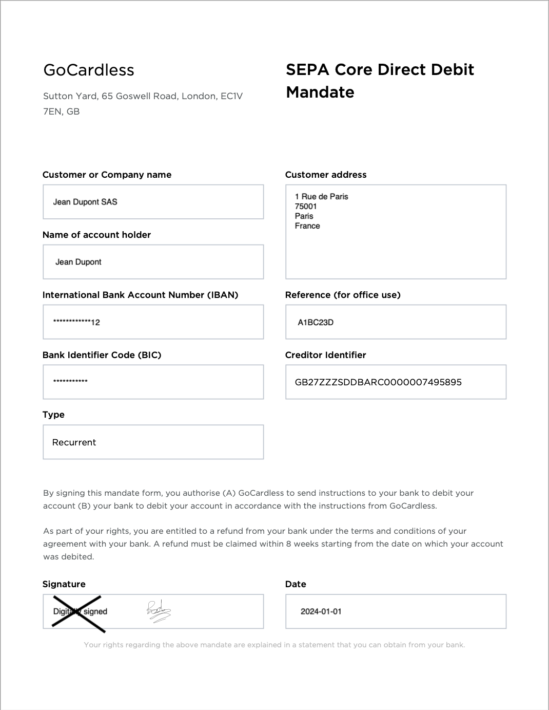 Keep a non-changeable electronic (e.g. scanned) or paper copy of the completed mandate in your own records for the duration of the mandate - i.e. until it is terminated/revoked (you must provide a copy of these at the request of GoCardless).