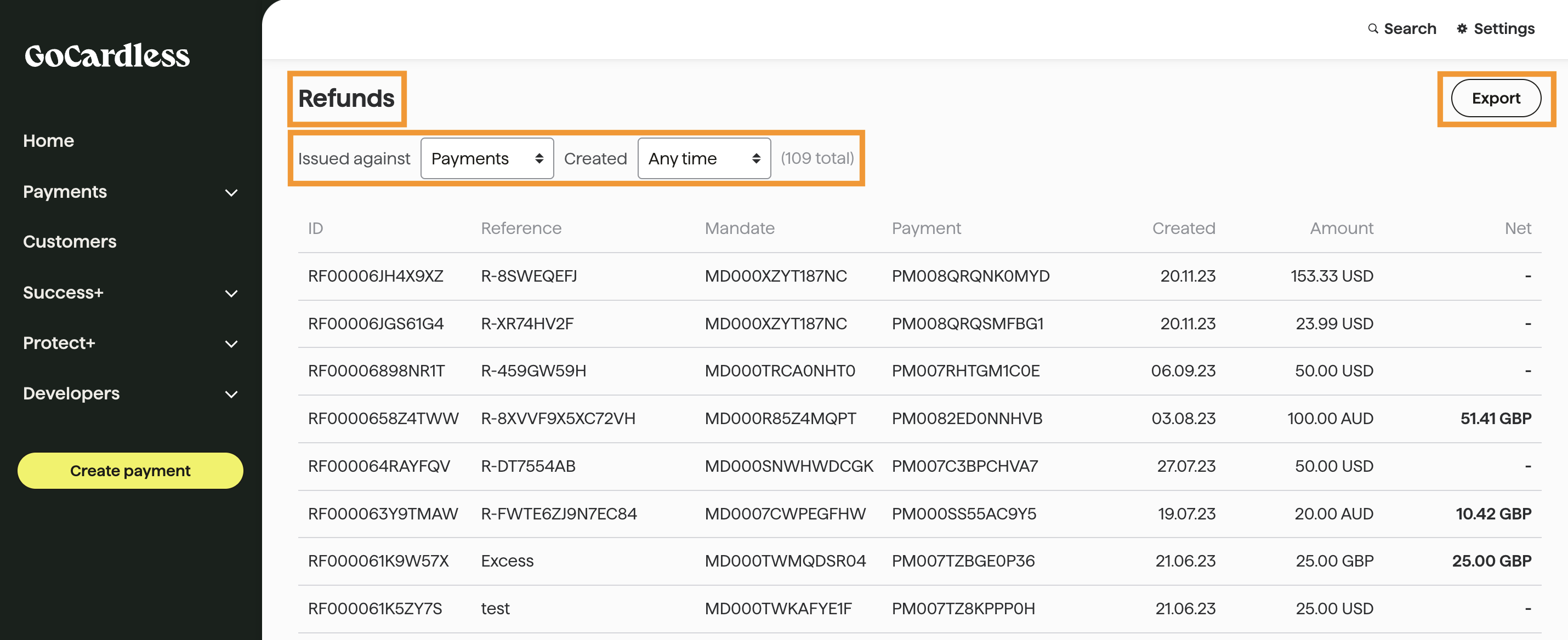 The Refunds page of the dashboard provides a list of all of the Refunds you’ve processed against Payments and/or Mandates in GoCardless. It includes details such as the Refund amount, reference, etc. You can click on any of the Refund records to drill down into the history of the Refund.