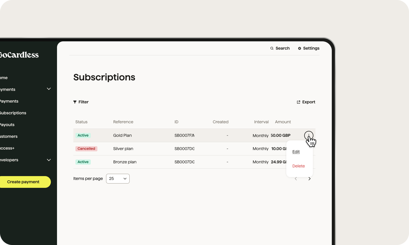 You can edit your subscription templates via the Subscriptions page or any Subscription details page. Both instances you can select “edit" from under the action dropdown shown below.