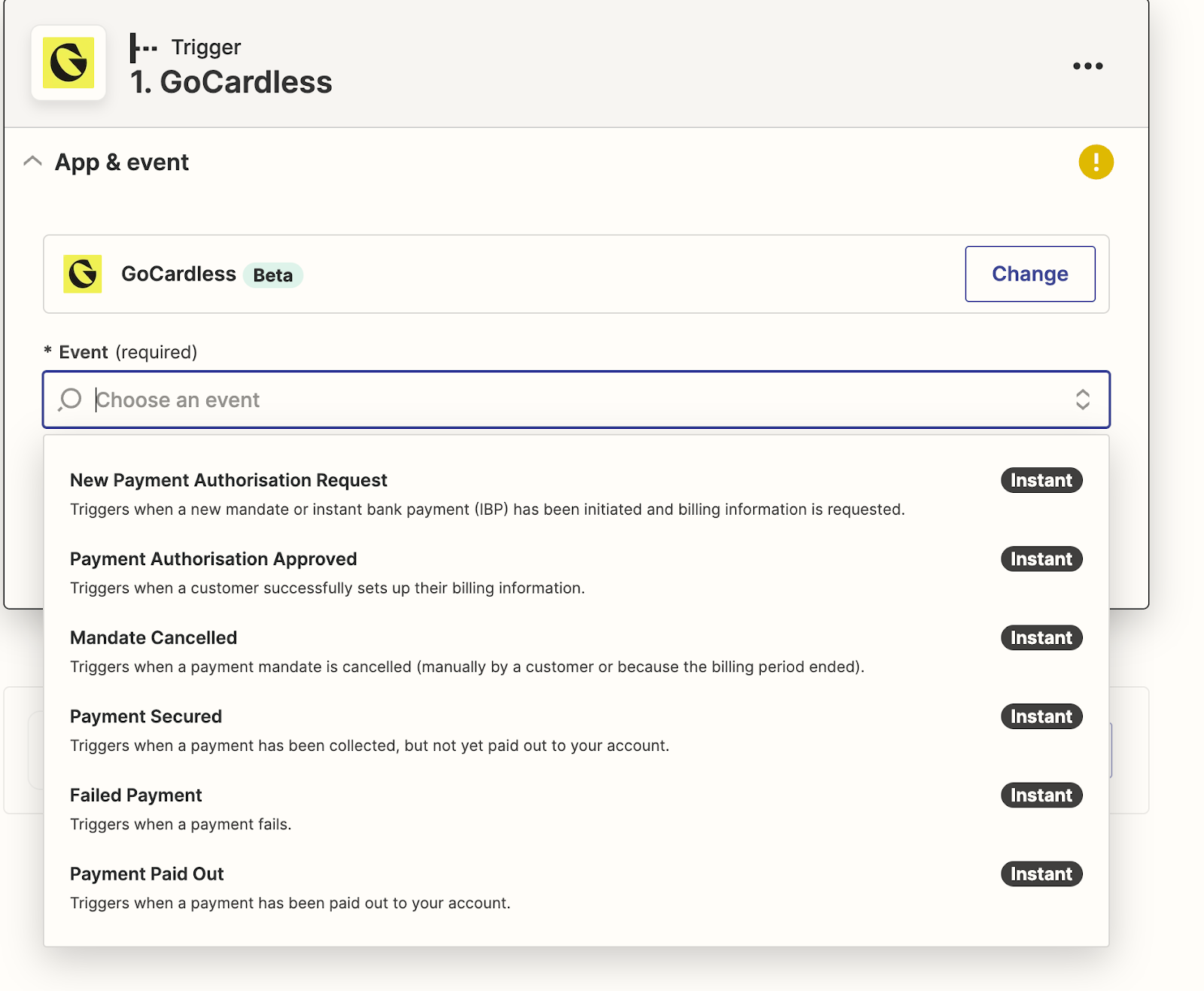 Once you select your trigger, Zapier will look for an instance of it in your GoCardless