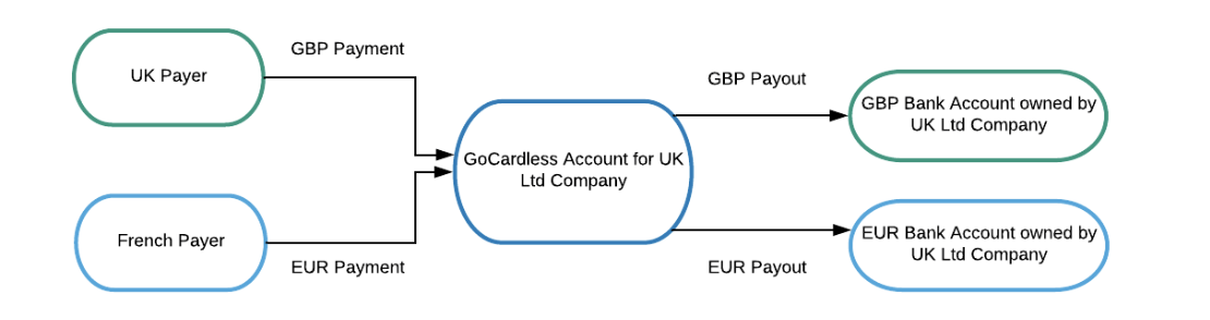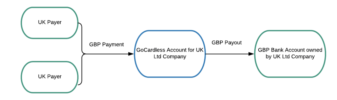 The model below shows payments being collected from payers, on behalf of one legal entity, in one currency. This is the most common one businesses use GoCardless.