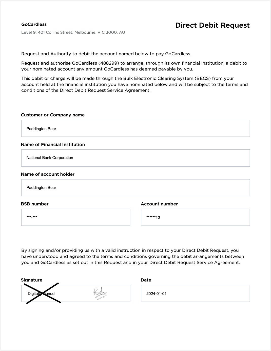Mantén un registro de que le proporcionaste a tu cliente una copia electrónica no modificable o en papel del mandato y el Acuerdo de servicios y una copia electrónica no modificable (p. ej. escaneada) o una copia impresa del mandato completado en tus propios registros durante al menos siete años después de la liquidación de la transacción de domiciliación bancaria final bajo el mandato (deberás proporcionar una copia a petición de GoCardless).