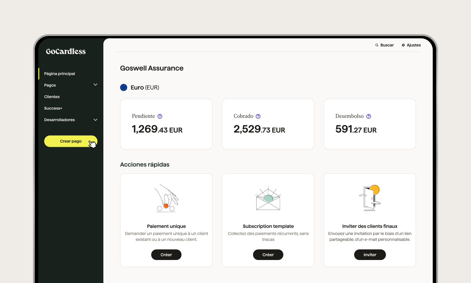 Dirígete a «Crear pago» desde la página de inicio de tu panel de control