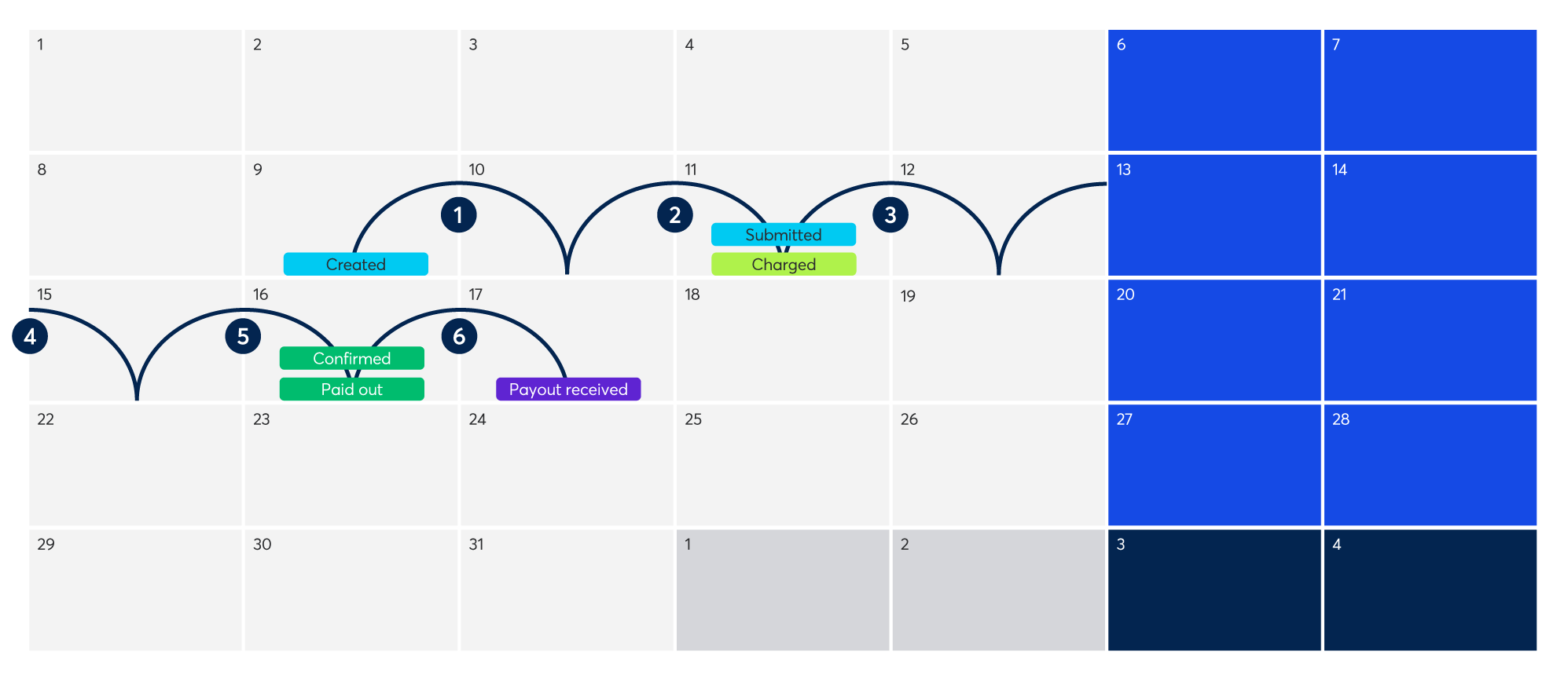 Nota: Para calcular los plazos, se asume que los pagos se cobrarán lo antes posible. Si se crea un pago por adelantado, por ejemplo con una fecha de cargo específica, el pago se enviará automáticamente en la fecha de cargo.