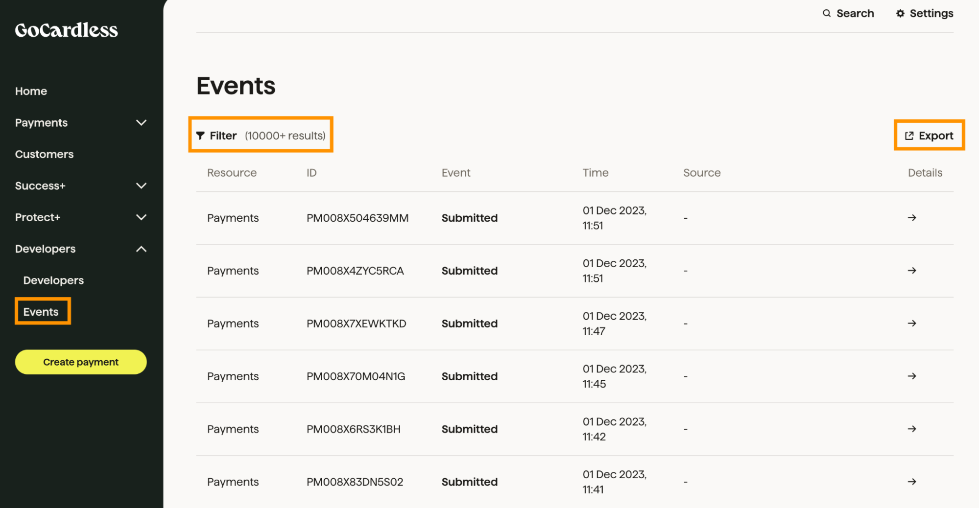 Vous pouvez exporter les données d'événements à partir du tableau de bord en accédant à la page Développeurs Événements, puis en sélectionnant Exporter dans le coin supérieur droit.