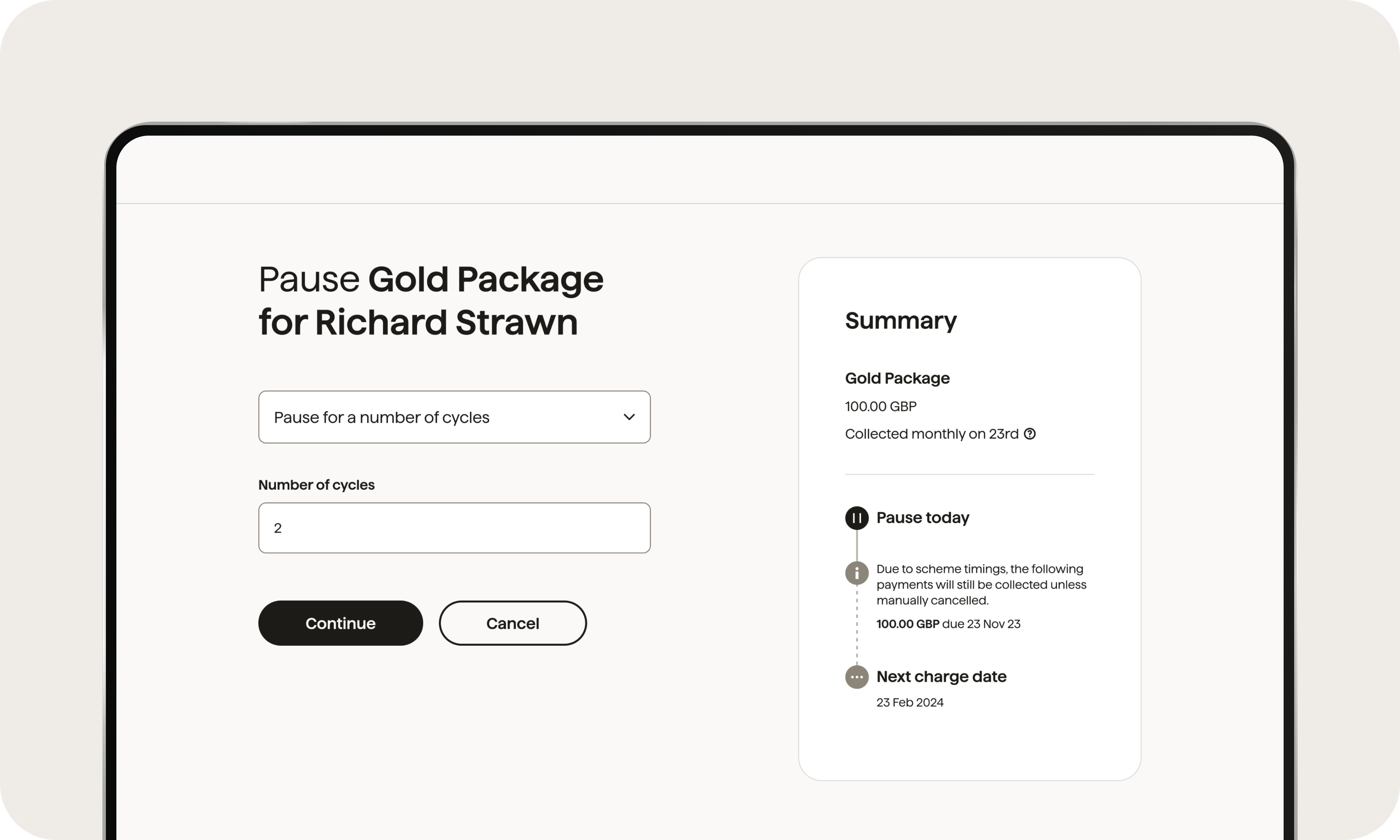 Réactivation : étant donné que vous avez suspendu votre abonnement pour une période spécifique, GoCardless calculera et affichera la date de votre prochaine facturation (qui est calculée sur la base de la période de préavis du programme concerné).